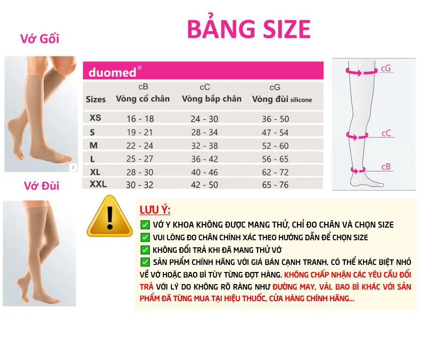 Do vớ y khoa điều trị bằng áp lực, do đó đo vòng chân để chọn đúng size là bắt buộc khi chọn mua vớ, để đảm bảo đủ áp lực điều trị.